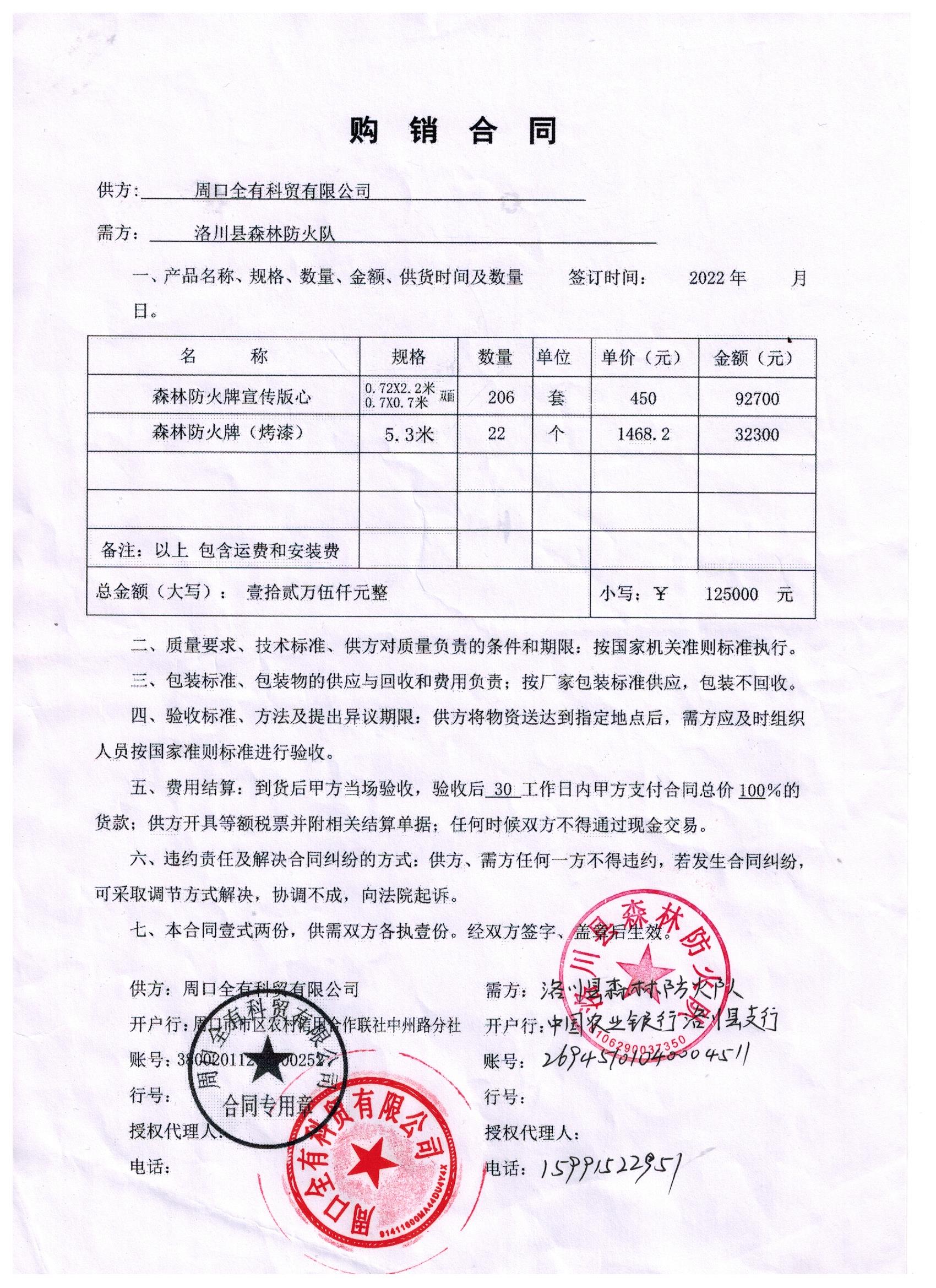 二、合同名称:洛川县森林防火队关于申请更换森林防火牌宣传版心封面及制作森林防火牌合同