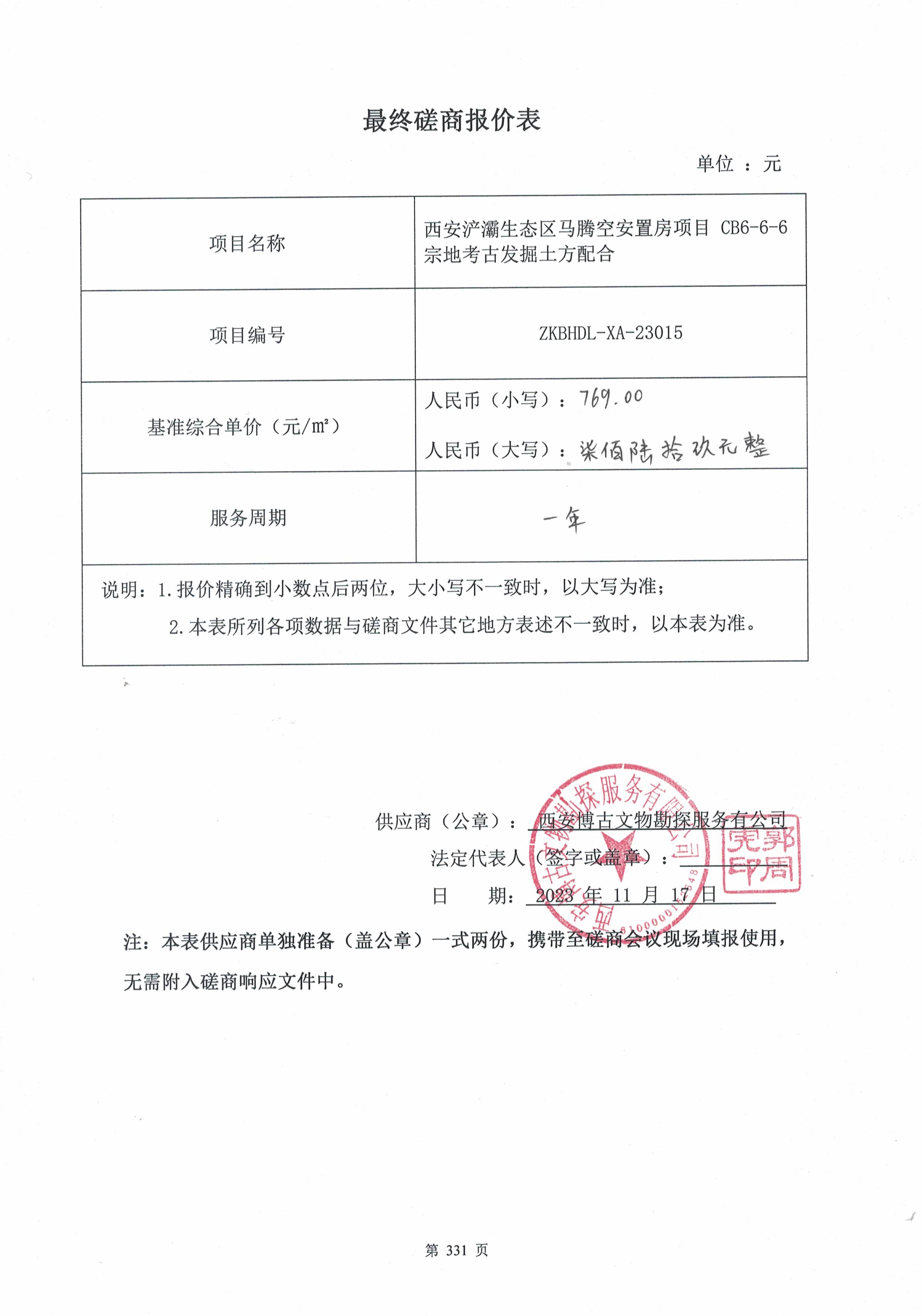 1 | 其他服务 | 西安浐灞生态区马腾空安置房项目CB6-6-6宗地考古发掘土方配合 | 详见竞争性磋商文件 | 详见竞争性磋商文件 | 一年 | 详见竞争性磋商文件 | 769.00 |