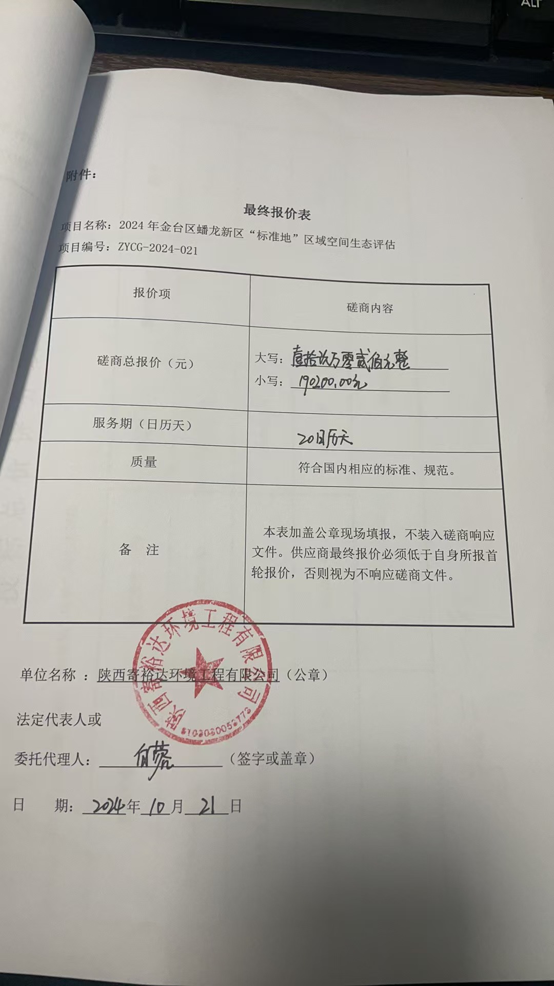 1 | 其他服务 | 2024年金台区蟠龙新区“标准地”区域空间生态评估 | 本项目全部内容 | 满足本次采购要求 | 20日历天 | 符合国内相应的标准、规范 | 190,200.00 |