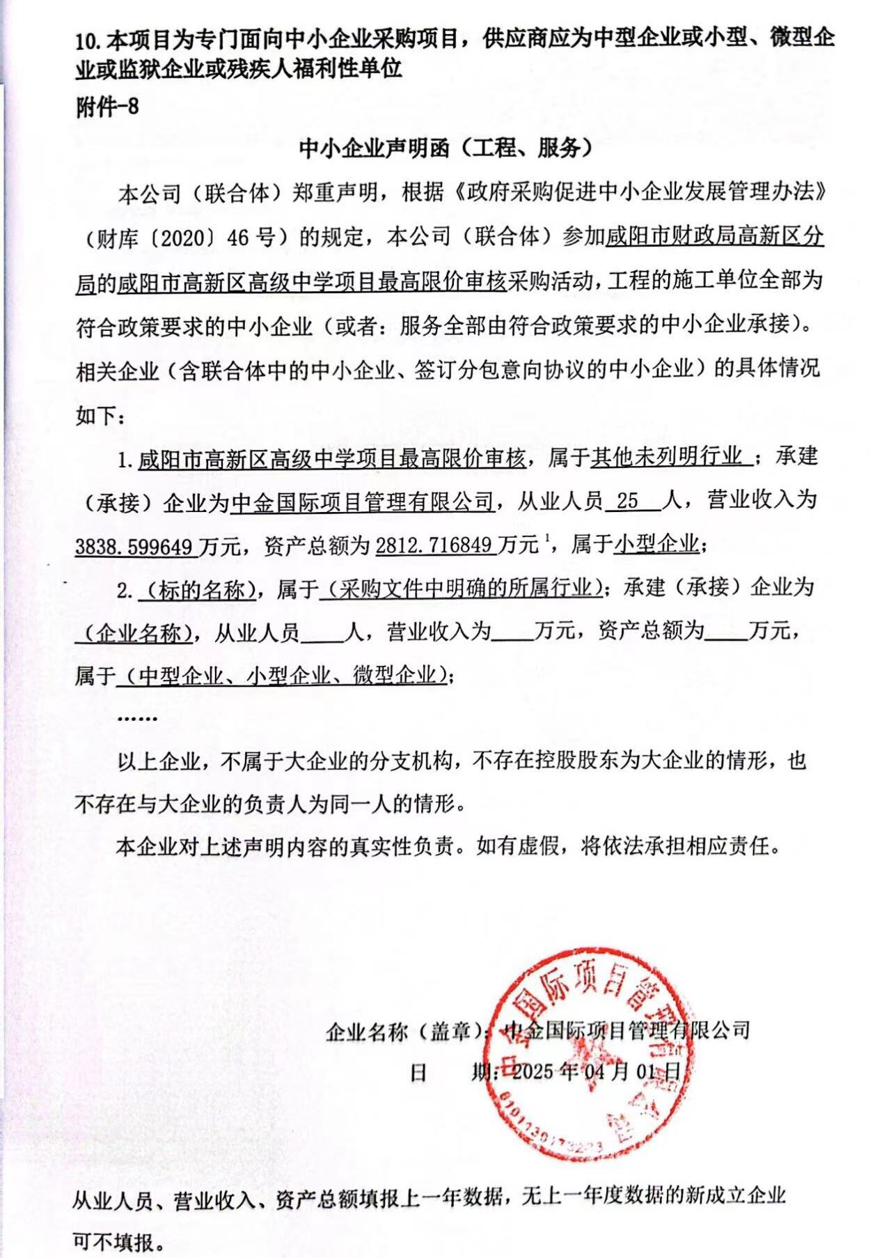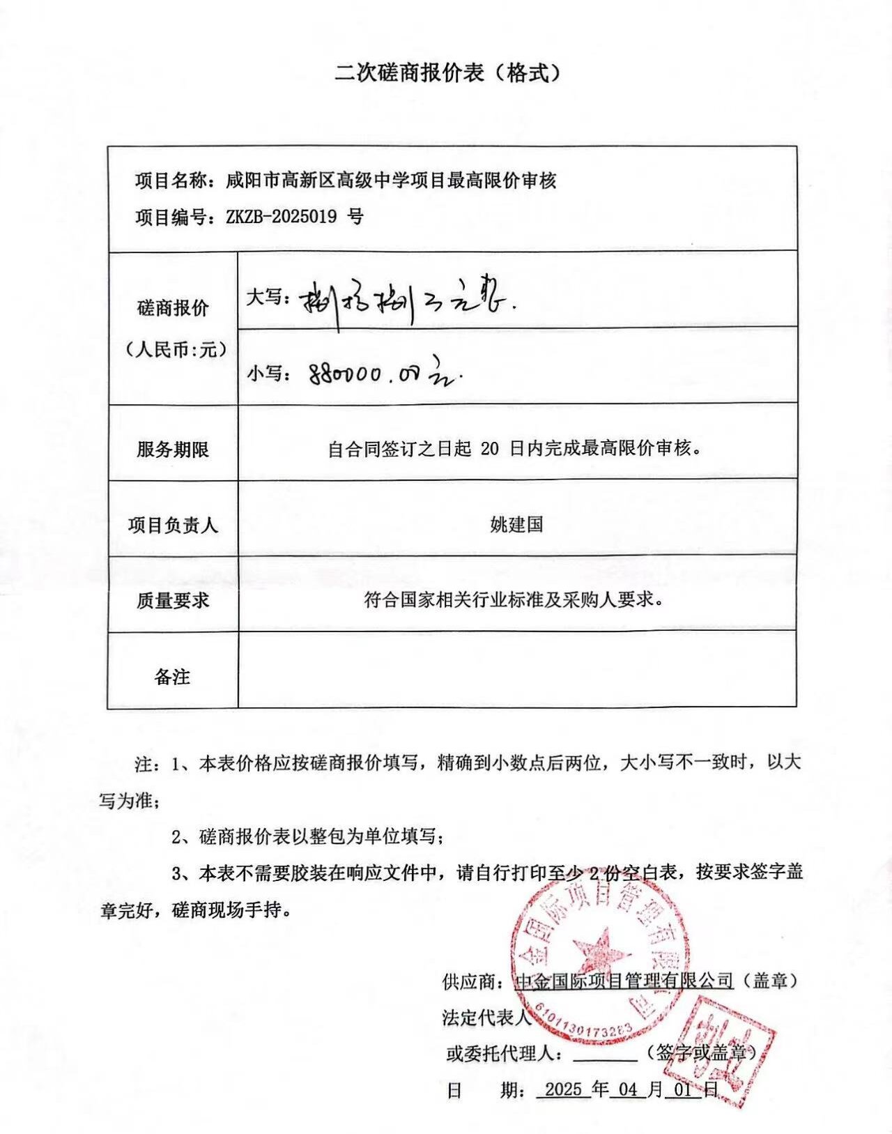 | 1 | 其他专业技术服务 | 最高限价审核 | 采购社会中介服务机构对咸阳市高新区高级中学项目进行最高限价审核并编制成果报告 | 满足磋商文件服务要求 | 自合同签订之日起20日内完成最高限价审核 | 符合国家相关行业标准及采购人要求 | 880,000.00 |