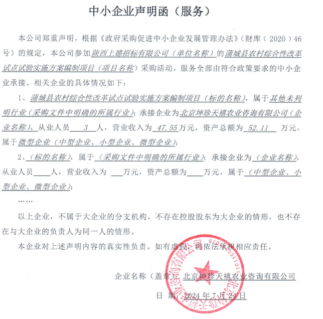 | 1 | 其他专业技术服务 | 农村综合性改革试点试验实施方案编制 | 详见竞争性磋商文件 | 符合竞争性磋商文件要求 | 2024年9月30日前完成项目调研、创建方案初稿编制、征求意见,以及方案修改和完善等工作,并提交《陕西蒲城县农村综合性改革试点试验实施方案》(包括正文和附表)。 | 符合竞争性磋商文件要求 | 348,000.00 |