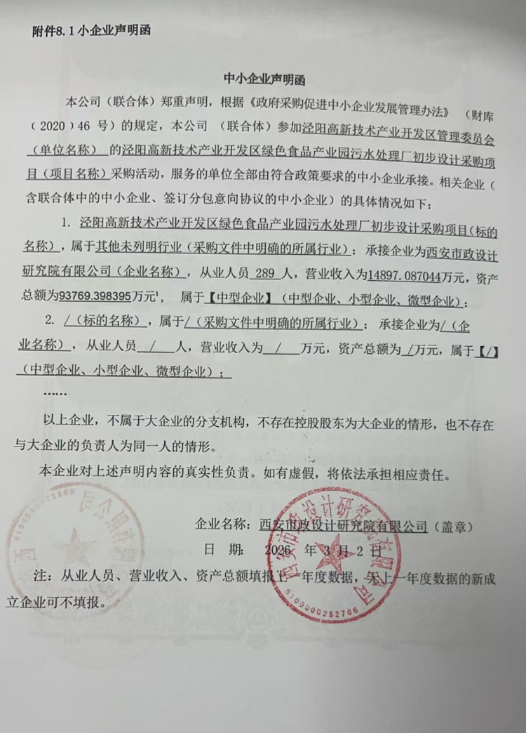 二、项目名称:泾阳高新技术产业开发区绿色食品产业园污水处理厂初步设计采购项目